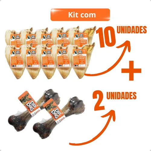 Kit 10 Mordedores Naturais Orelha Bovina com 2 Ossos Fêmur para Pets