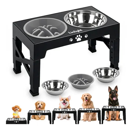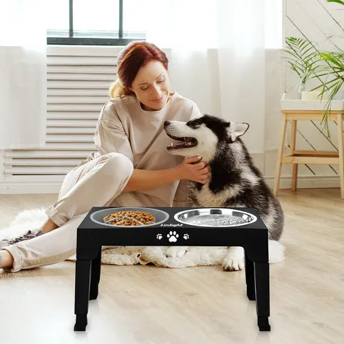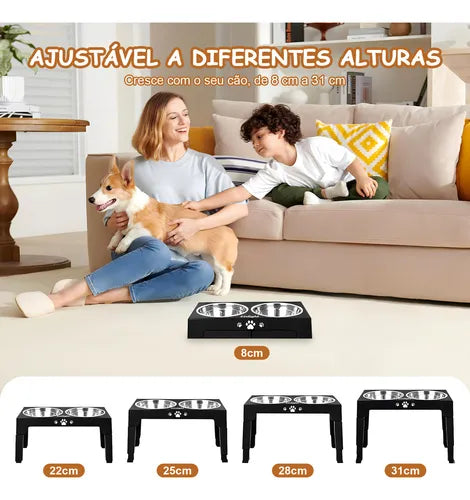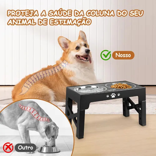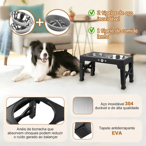 Comedouro e Bebedouro Elevado Linlight em Inox Ajustável Antiderrapante Preto